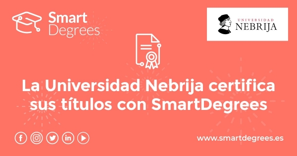 Los egresados de la Universidad Nebrija ya tienen su título certificado en modo digital. Con esta verificación, a través de la tecnología blockchain y la plataforma SmartDegrees, los alumnos graduados en cualquiera de los estudios que conforman la oferta educativa de Nebrija pueden acreditar su titulación ante empresas y reclutadores de una forma rápida y efectiva. En principio, se benefician de esta iniciativa -englobada bajo el nombre de Nebrija Smart Portfolio– unos 170 alumnos que han finalizado sus estudios de grado en los cursos 2017-2018 y 2018-2019. Más adelante, estará abierta al resto de egresados. Además, la iniciativa es conforme con el estándar Credenciales Verificables de la Comisión Europea.